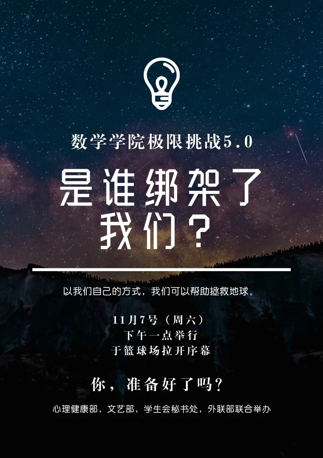 心理健康部、文艺部、学生会秘书处、外联部四部联合举办的“极限挑战5.0之谁绑架了我们”活动正式拉开了序幕,参赛者6人成一小组,组成了16只队伍,共计96人。