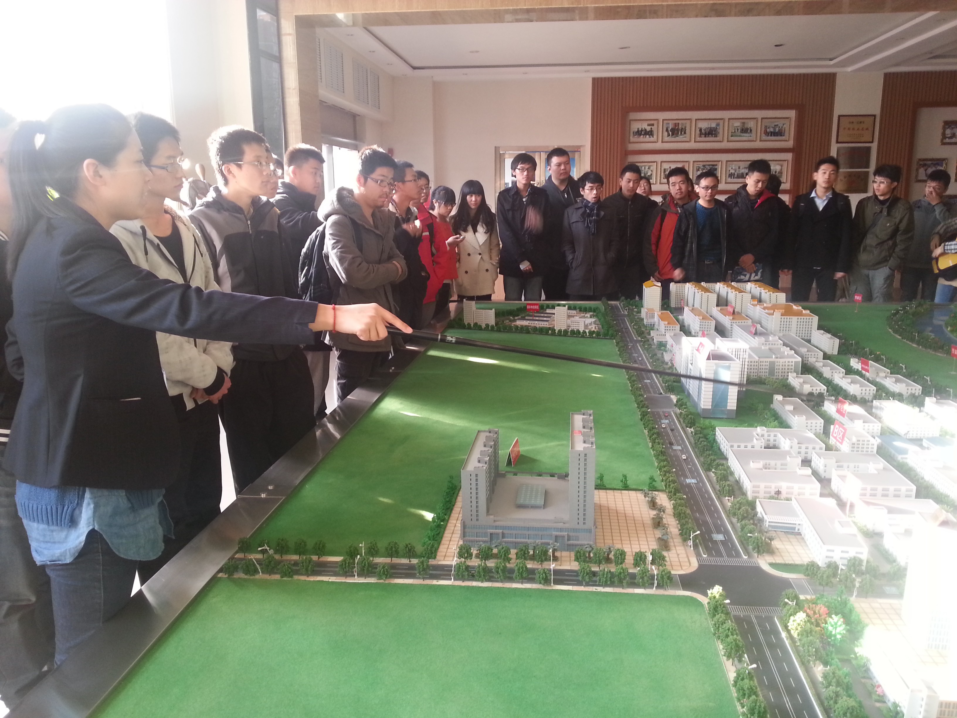 我们首先来到东北袜业办公区参观,负责接待的工作人员用沙盘为同学们详细讲解了东北袜业园的具体情况和未来规划。工作人员带我们参观了袜子从织造、缝头、染整的生产工艺流程以及设备、配件维修、原材料、包装物、物流、生活服务等完整的产业链条。