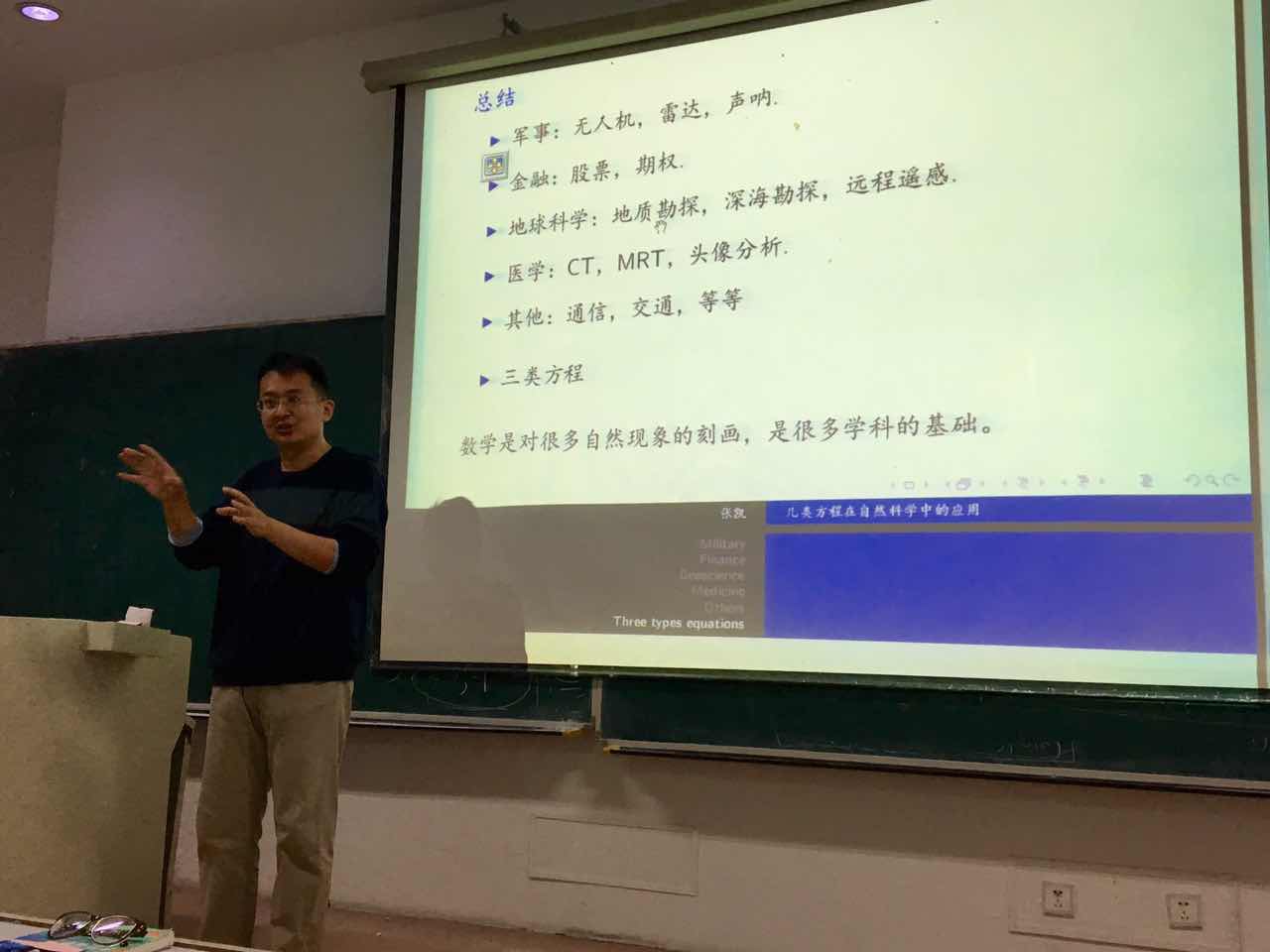 下午1点整,张凯老师开讲。首先,张凯老师图文结合地阐明了计算数学在军事、金融、地球科学、医学等方面的重要应用。接下来,张凯老师结合自身经历,诠释了三类方程在今后职业发展中的帮助。最后,张凯老师关掉投影,拿起粉笔,书写学生实例讲述未来发展的无限可能;走下讲台,闲话家常,用过来人的体悟规勉迷途的学生。