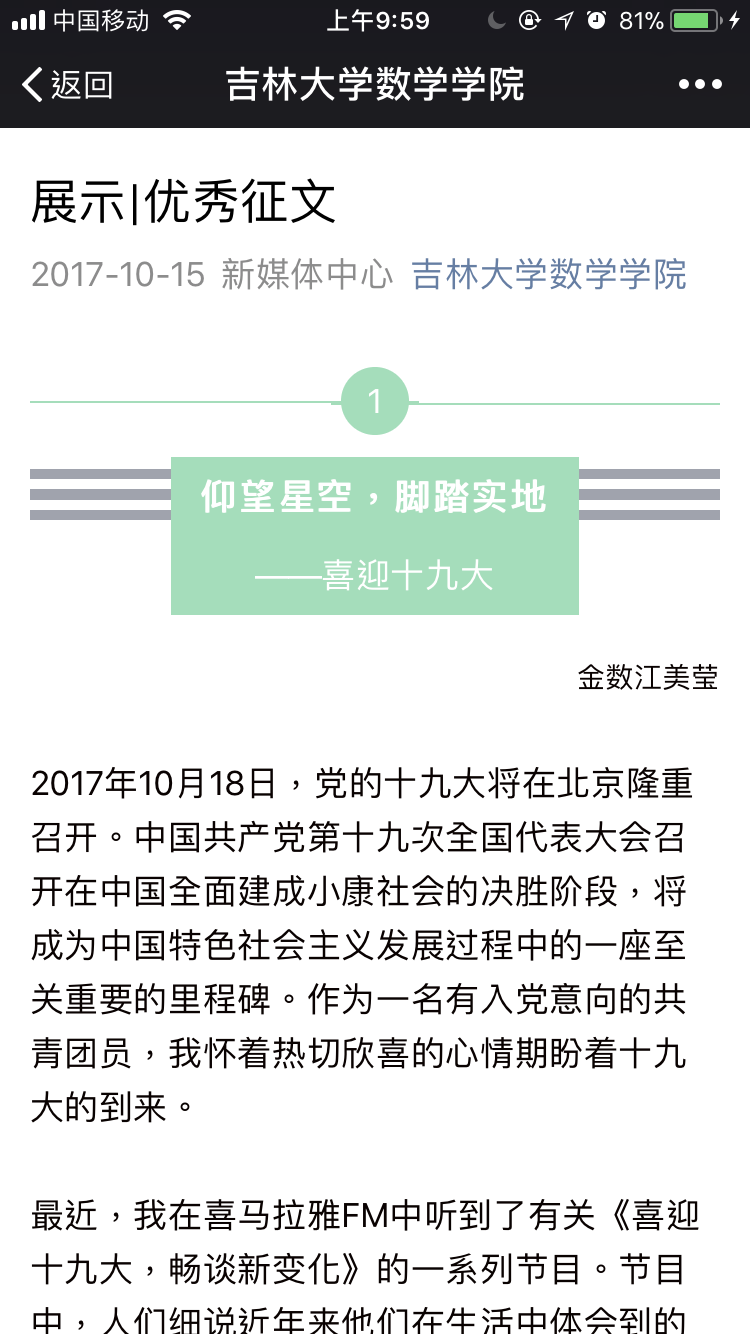 同学们对十九大的召开都充满期望和信心,踊跃投稿,谈了谈对十九大的理解和感想,截止十月九日晚,团委社会实践部收到了40篇稿子,经过认真评定,确定获奖稿件:一等奖《当青春遇上使命》,二等奖《仰望星空 脚踏实地》、《书写最动人的诗篇——敬党的十九大》,三等奖《喜迎十九大》、《听党指挥 旗帜飘扬》。博彩App