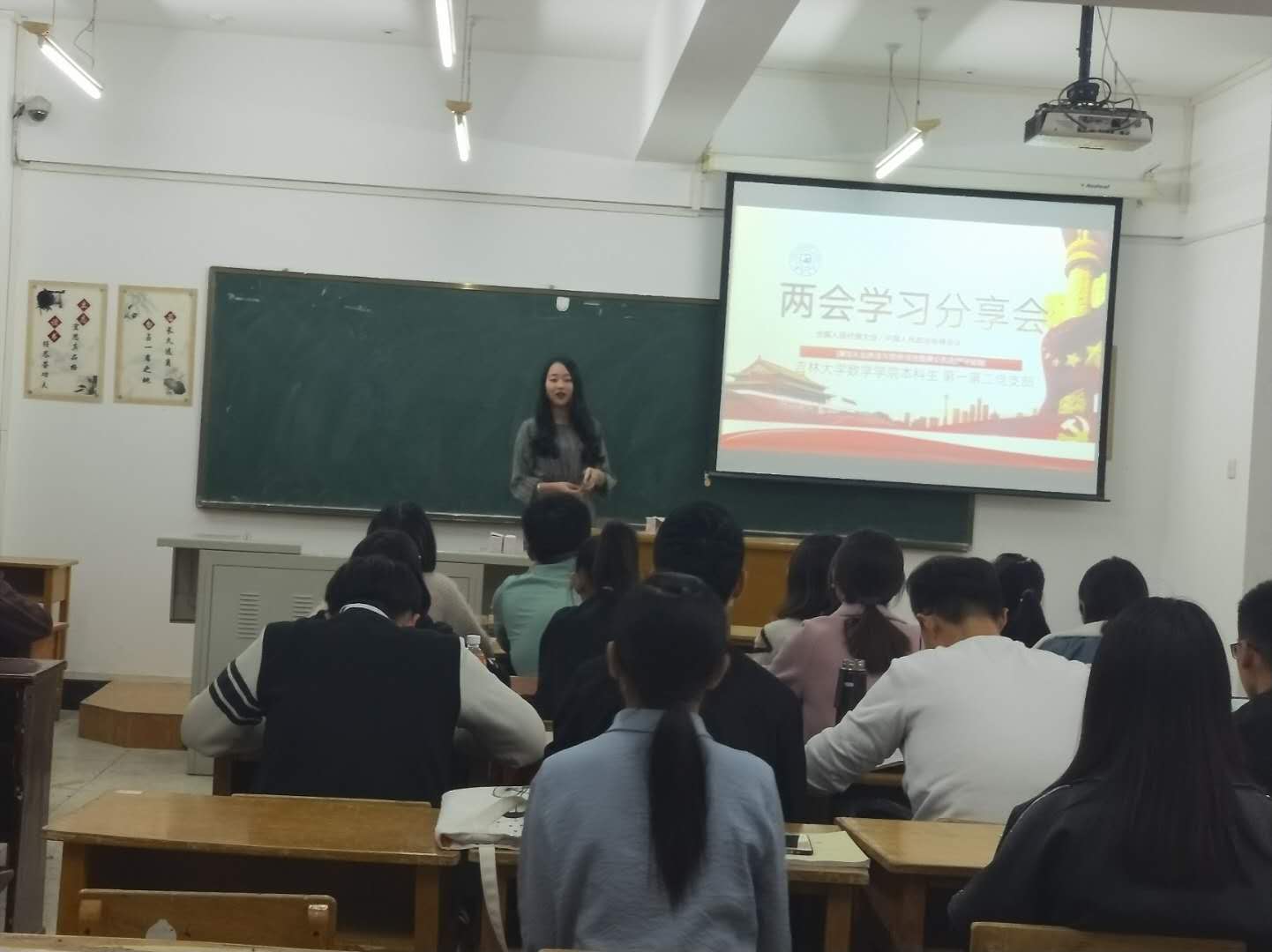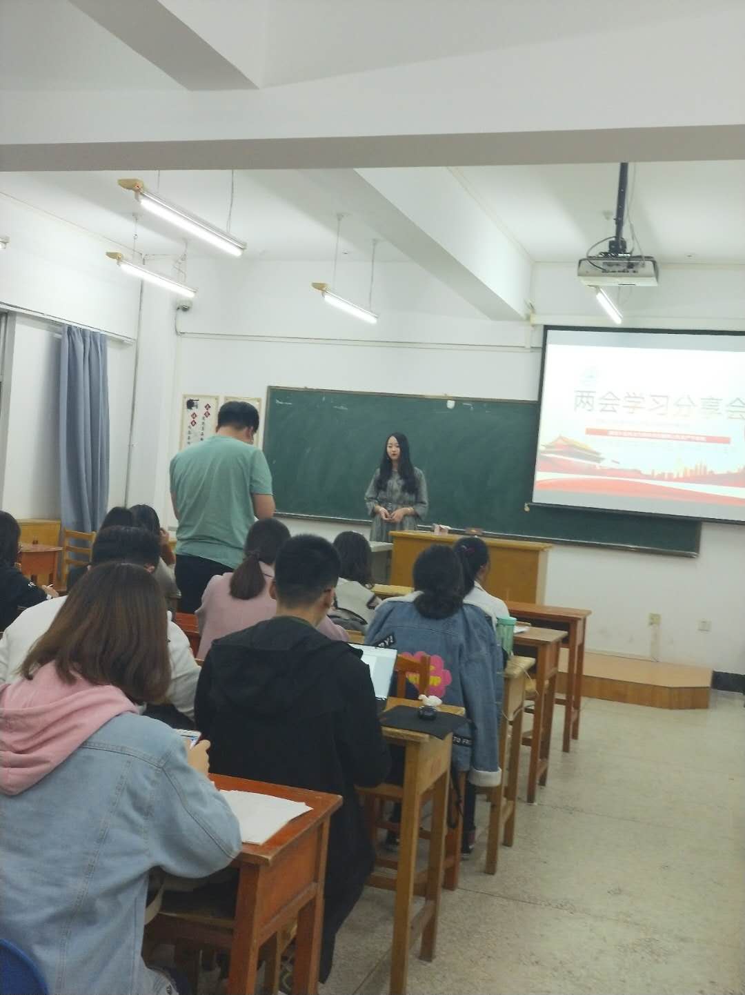 会议第二项内容,组织委员李玉涵带领大家共同学习2018全国两会的内容。从两会基本情况、会议主要内容以及十大热点三个方面进行讲解,由表及里,层层深入,从中央政策到民生改革。随后,积极分子进行积极的发言,表达了个人关于两会的学习心得和独特的见解。