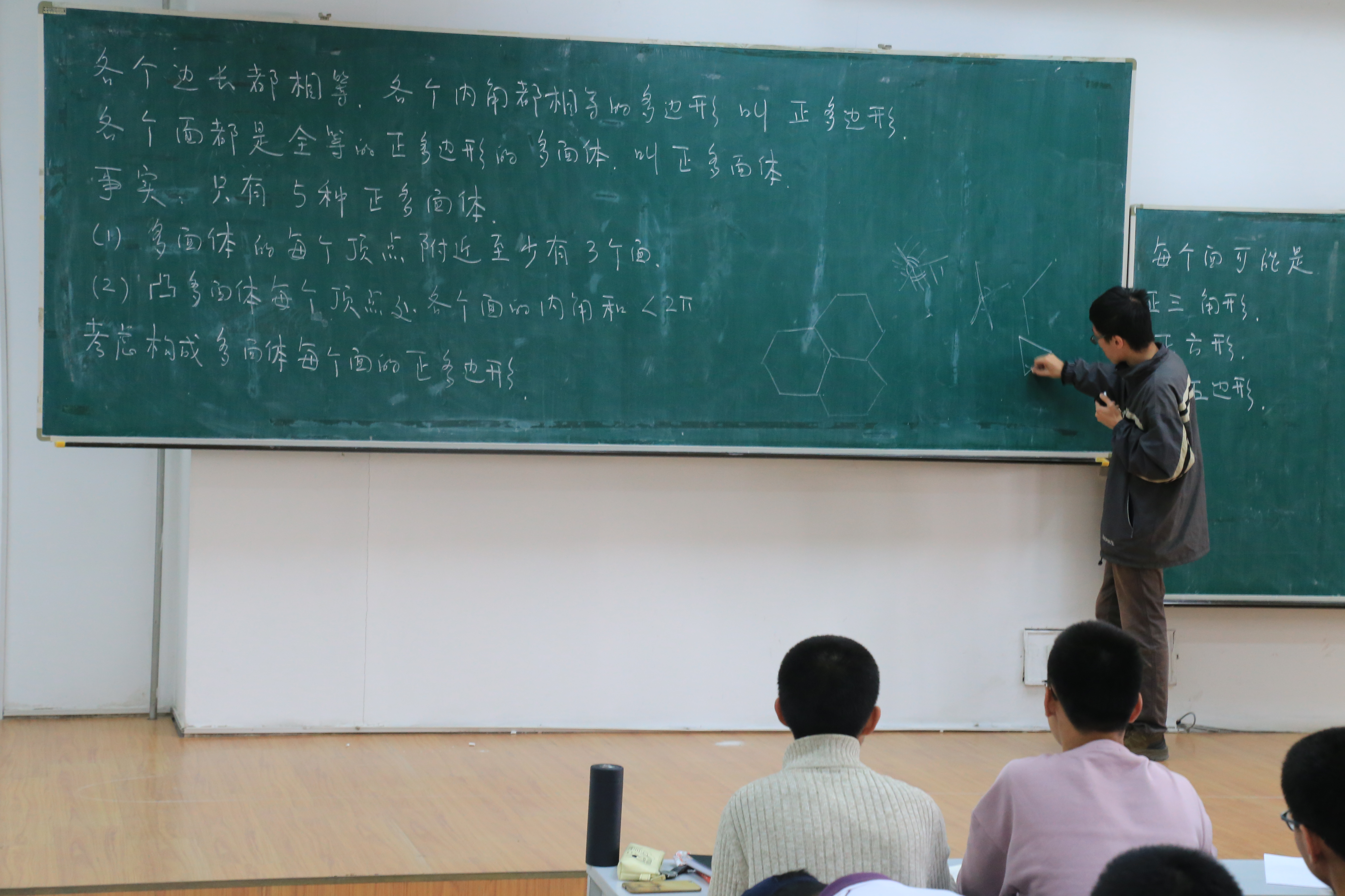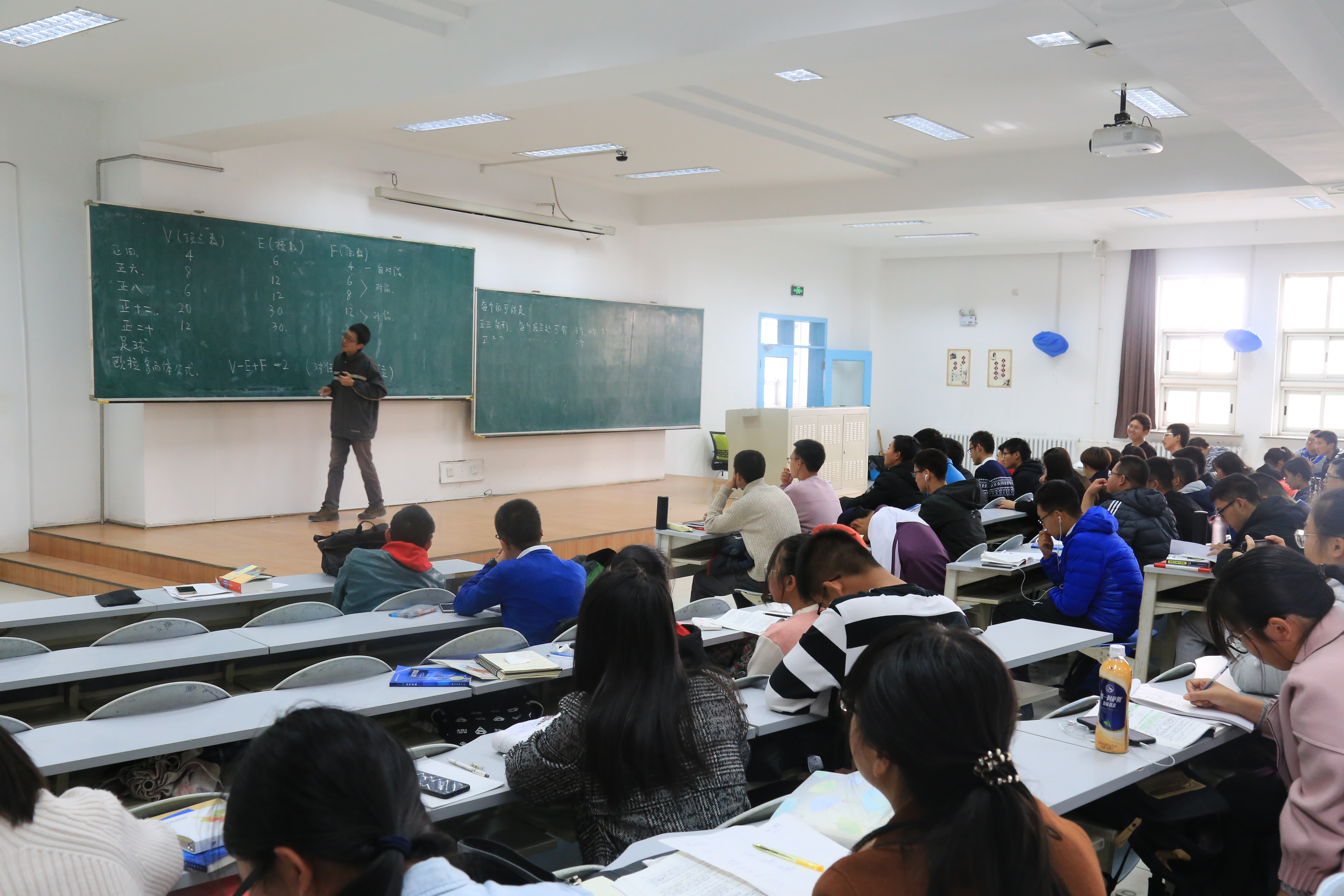 讲座第二部分,张一木讲师通过向同学们介绍正多面体结构,带领同学们初步了解拓扑学。据了解,在参加此次讲座之前,同学们对空间正多面体的了解仅限于正八面体及以下。而在此次讲座中,张一木讲师为同学们解析了正二十面体的结构与性质,不仅揭开了正多面体神秘的面纱,更加显示了几何之美。帮助同学了解一些书面知识位于次要,真正鼓励同学勇于探索发现才是主要。