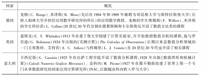 进入19世纪以后,纯粹数学开始兴起并迅速占据了数学的主流位置。而受限于社会生产规模和计算工具等外部条件,数值分析在数学中暂时处于较为次要的地位[12]。从19世纪末到20世纪40年代之前,数值分析取得了一定程度的发展,一些重要的算法如龙格-库塔法(Runge-Kutta method)、有限差分法(finite difference method)被相继发现,德国、英国、意大利等国家还开设了一些数值分析的课程(表1)[13]。