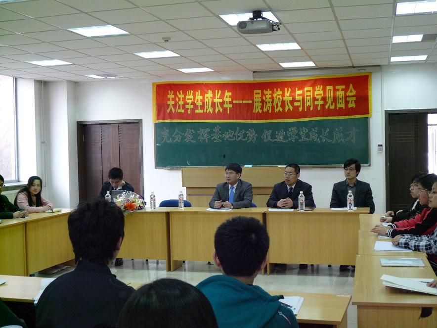 4月11日下午,校长展涛来到博彩App 与09级基地班同学进行了以“充分发挥基地优势,促进学生成长成才”为主题的座谈。展涛校长与同学们一起讨论了关于大学生活、学习情况等与同学们息息相关的话题,并对同学们提出了“打好基础”、“经常交流”、“树立信心”等希望。