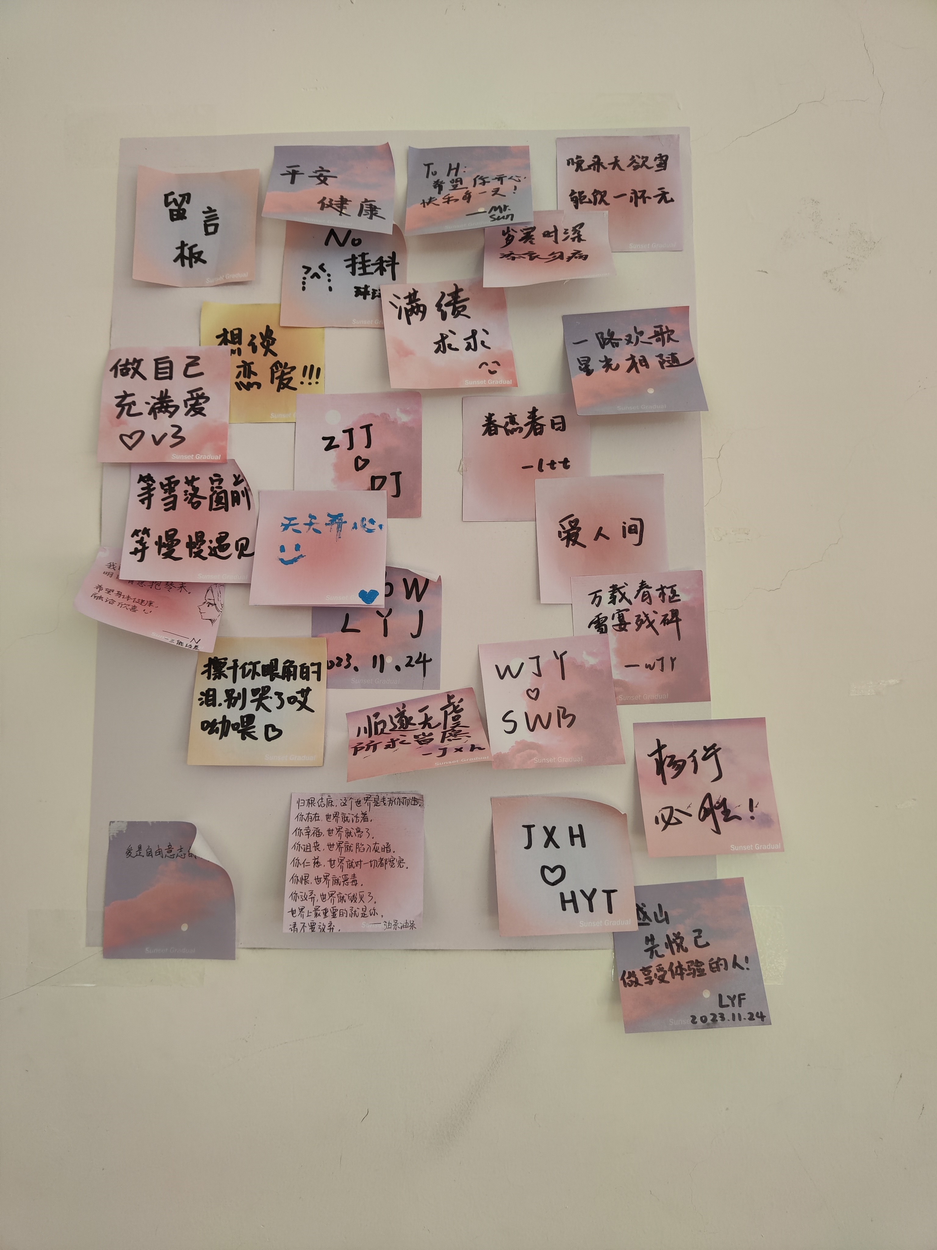 在各位同学完成自己的作品之后,便纷纷来到教室前面,领取工作人员精心准备的便利贴,随后同学们或者在便利贴上写下自己的愿望,由工作人员将这些愿望贴在心愿墙上,或者写下对陌生人的祝福,附在自己作品的后面,由工作人员连同作品一起送至长春市特殊教育博彩App ,实现快乐的传递。