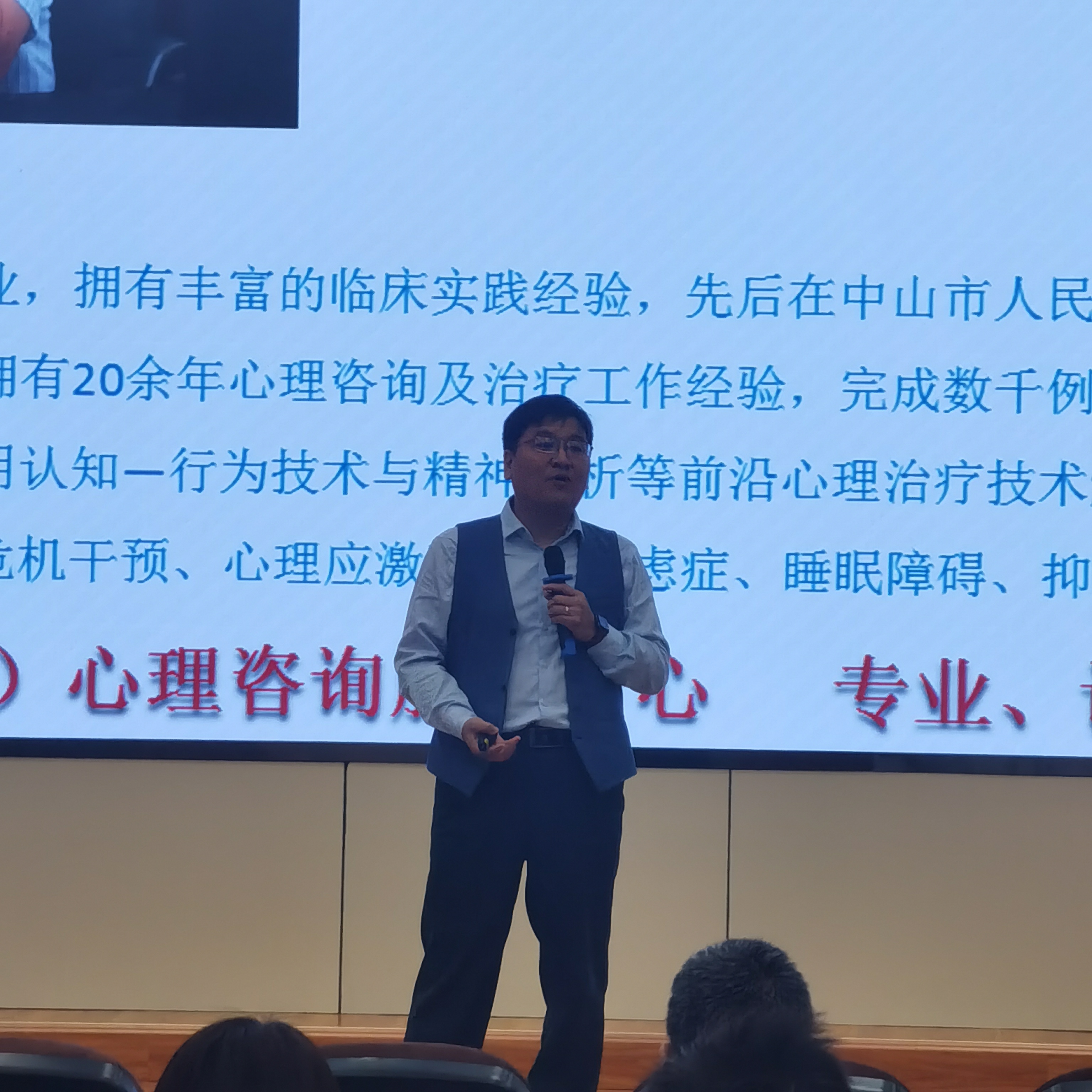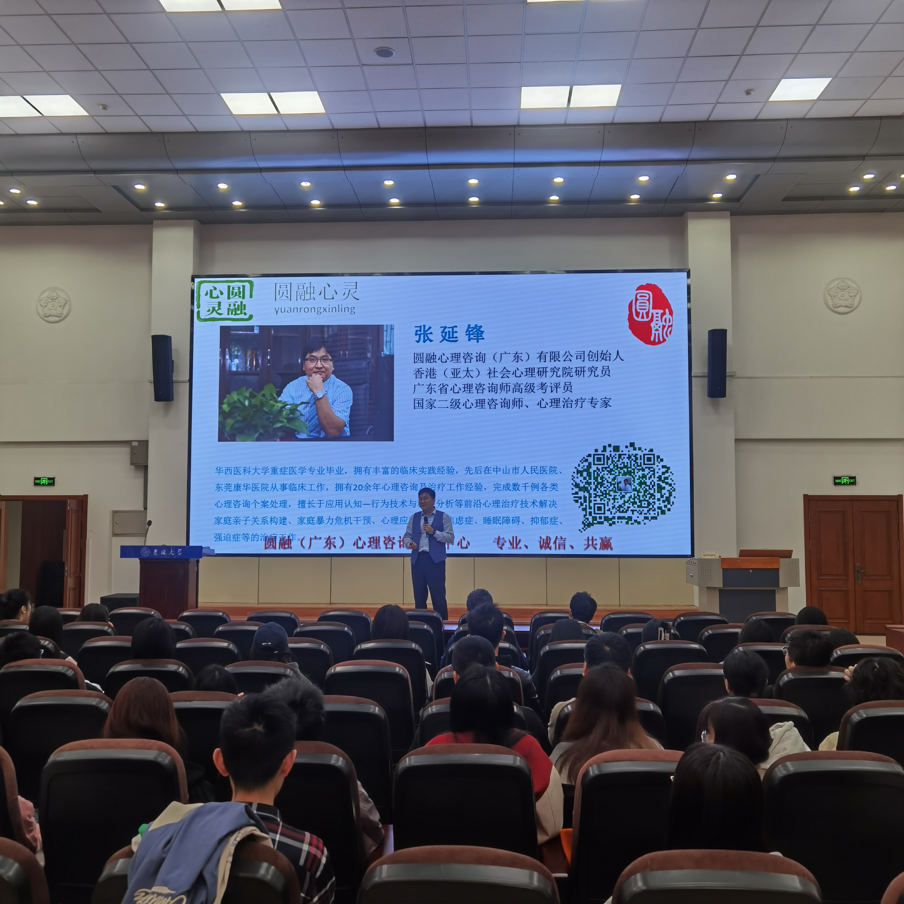 本次讲座邀请到了圆融心理咨询(广东)有限公司创始人张延锋老师。张老师拥有多年临床经验,是香港(亚太)社会心理研究院研究员,广东省心理咨询师高级考评员,国家二级心理咨询师,中山市创业指导委员会专家。