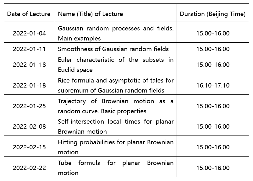 Abstract: This course aims to provide a solid introduction on the geometry of Gaussian random curves. Since the theory of geometry of Gaussian random curves is based on the concept of Gaussian random process and fields, the first part of the course will be devoted to some properties of this process and fields. And the second part of the course is devoted to discussion of geometry of Gaussian random curves like the Self-intersection local times for planar Brownian motion and the hitting probabilities for planar Broownian motion. Professor Andrey will give students some time to understand the knowledge and give some small questions about the lecture.