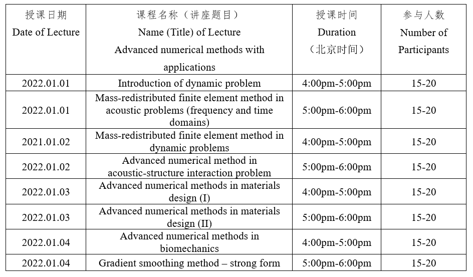 课程摘要:This short course will cover a range of numerical methods to solve complex multi-physics dynamic problems. The stability, convergence, accuracy and efficiency of different types of numerical methods are discussed. In addition, the applications of numerical methods in the complex acoustic-structure interaction and material design will be introduced. The aim of this short course is for upper-undergraduate and graduate students who want to obtain formal training and experience related to numerical methods for multidisciplinary analysis.