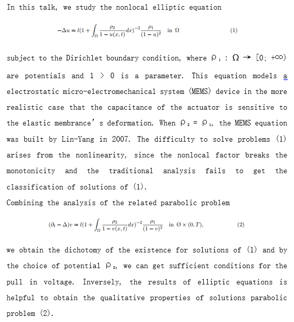 报告题目:On a nonlocal MEMS equations with variable dielectric permittivity