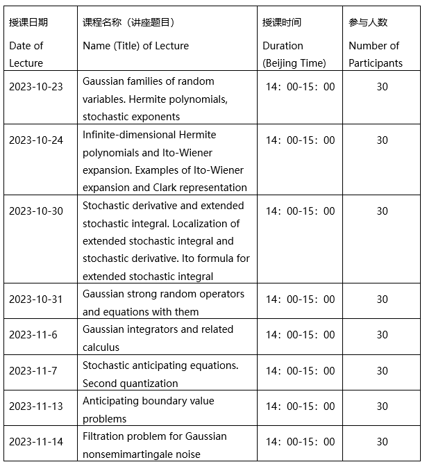 课程摘要: This course is devoted to the stochastic anticipating equations with the extended stochastic integral with respect to the Gaussian processes of a special type. Professor Andrey will give students some time to understand the knowledge and give some small questions about the lectures.
