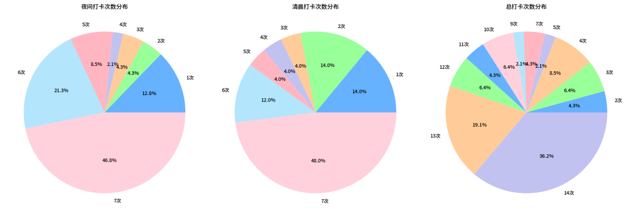 根据打卡数据统计,有超过半数的参与者坚持完成每日打卡,整体展现出良好的作息意识与自律性。从时间分布上看,晚间早睡打卡人数略多于清晨早起,显示出早起对部分学生而言更具挑战性。尽管线上数据无法完全反映实际作息,但仍为了解学生生活状态提供了重要参考,也进一步提醒我们应重视科学作息,合理安排学习与休息之间的平衡。