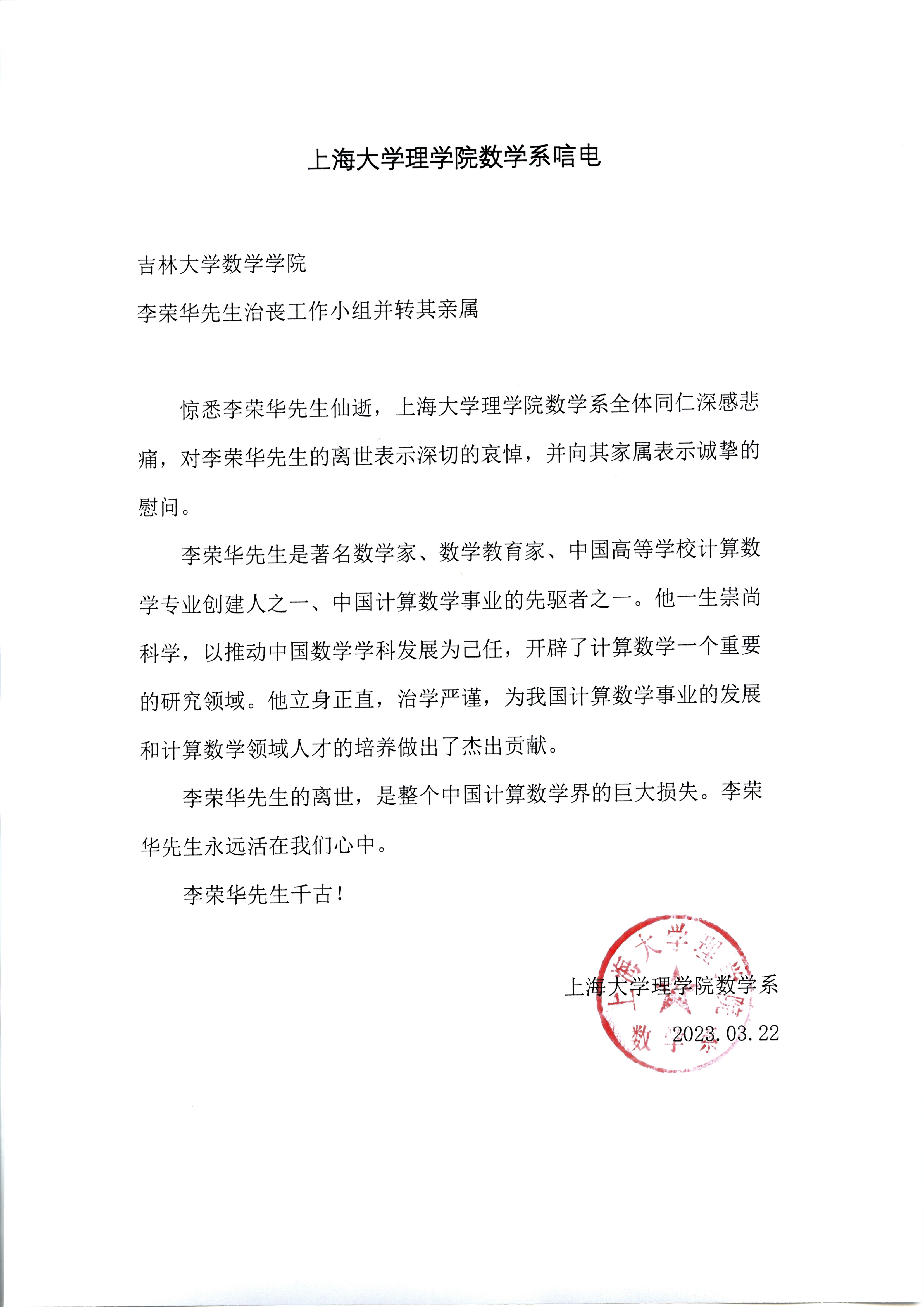上海大学理博彩App 数学系唁电