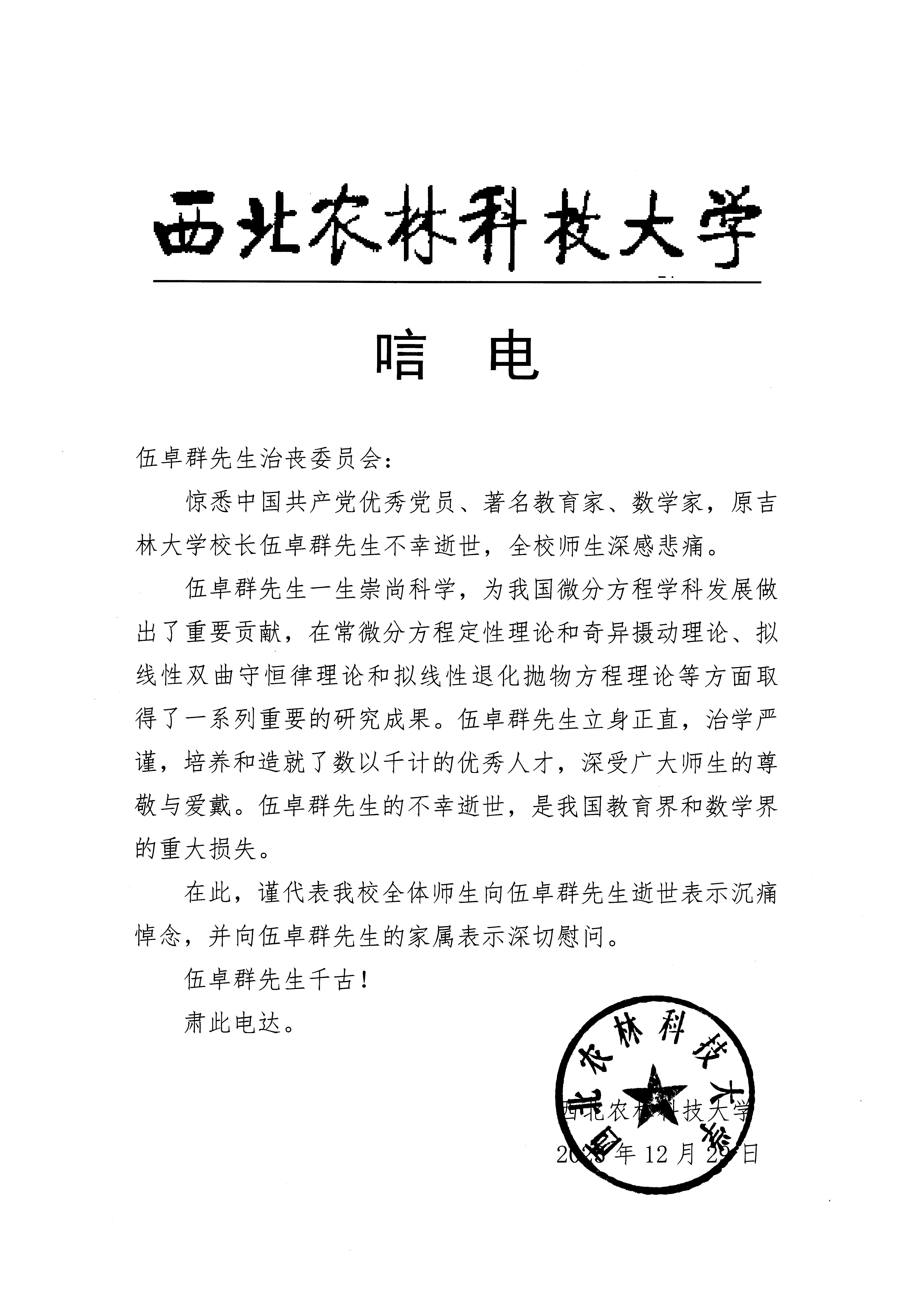 西北农林科技大学唁电