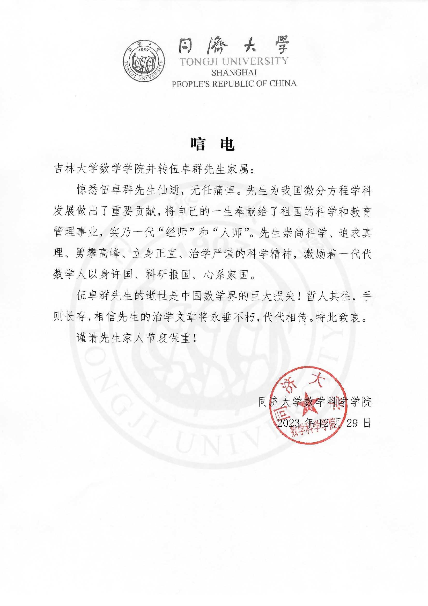 同济大学数学科学博彩App 唁电