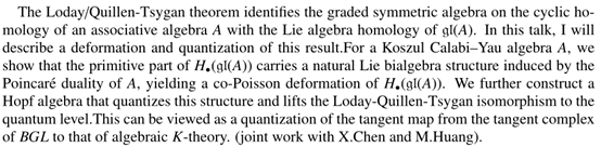 Presenter Introduction: Professor Farkhod Eshmatov is the Associate Dean of School of Natural Sciences and Humanity in New Uzbekistan University (Tashkent, Uzbekistan). He obtained his Ph.D in Mathematics at Cornell University in 2007. He mainly works on algebra, noncommutative algebraic geometry, integrable systems, infinite dimensional Lie algebras and mathematical physics. He has made many important works on noncommutative Poisson structure and symplectic structure, invariants of matrices, Calabi-Yau algebras, derived schemes, and so on. Recently, he and his coauthors introduced a novel approach that employs techniques from noncommutative Poisson geometry to comprehend the algebra of invariants of two matrices, and further entirely solved the open problem of computing the algebra of invariants of two matrices of order 4.